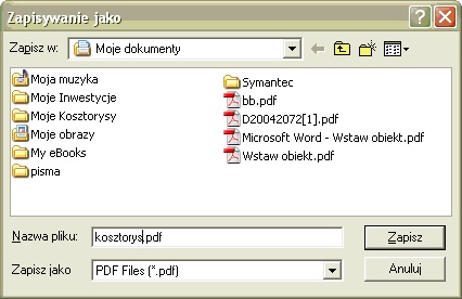 Uruchomienie programu instalującego spowoduje pojawienie się w spisie drukarek nowej drukarki o nazwie zawierającej ‘PDF” np. xxxPDF Writer. Gdy teraz wejdziemy w menu Plik hasło Drukuj wybierzemy Ustawienia i jako drukarkę aktywną zaznaczymy Drukarkę PDF, to po zatwierdzeniu decyzji drukowania zobaczymy okno zapisywania na dysk, w którym nadamy nazwę tworzonemu plikowi PDF.