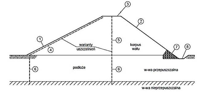 Oznaczenia użyte w schemacie: 1 – skarpa odwodna 2 – skarpa odpowietrzna 3 – korona wału 4 – ekran szczelny 5 – rdzeń szczelny 6 – uszczelnienie podłoża 7 – drenaż 8 – rów odwadniający