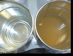 - po lewej stronie wiadro z wodą pochodzącą z testu JET dla gruntu stabilizowanego wapnem