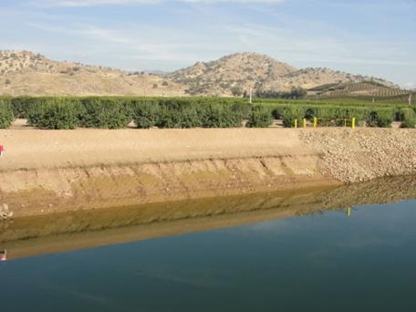 Zdjęcie 4. Kanał Friant-Kern, Kalifornia, USA. Nabrzeże kanału stabilizowane wapnem. Po prawej stronie zdjęcia, w oddali widoczne zniszczenia, jakie woda poczyniła w nabrzeżu nie poddanym procesowi stabilizacji wapnem. |