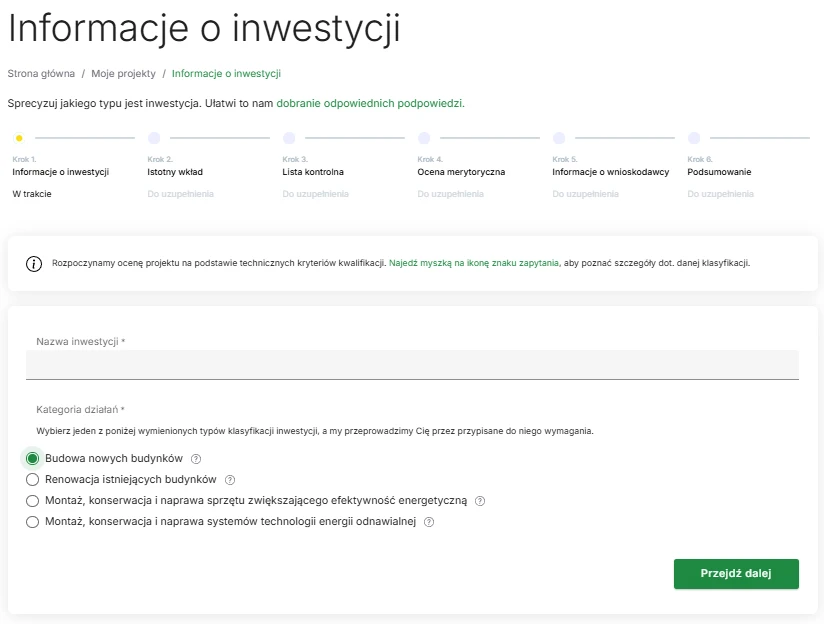 Krok 1 – Informacje o inwestycji i kategoria działań