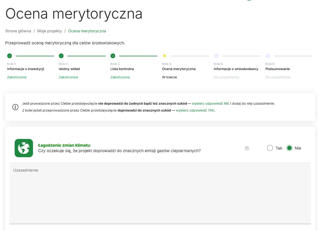Techniczne kryteria kwalifikacji zasady DNSH dla poszczególnych celów środowiskowych są różne w zależności od tego, do jakiego celu środowiskowego dany projekt będzie wnosił istotny wkład. Aplikacja AthDNSH umożliwia przeprowadzenie oceny projektu pod kątem tych wymagań. Na poniższym przykładzie prześledzimy ten proces przy założeniu wnoszenia istotnego wkładu w adaptację do zmian klimatu.