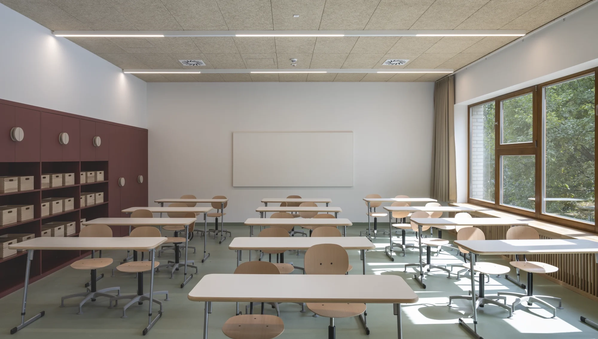 W środku w miejscach intensywnie użytkowanych, takich jak np. hol, korytarze, zastosowano trwałe i łatwe w utrzymaniu materiały, m.in. posadzki żywiczne i okładziny z płyt włókno-cementowych. Do wykończenia większości pomieszczeń i wyposażenia przestrzeni wykorzystano elementy drewniane, które nadają ciepłego i przyjaznego charakteru wnętrzom. Warto zwrócić uwagę, że w budynku zastosowano odpowiednią izolację akustyczną, co sprawia, że jest ciszej. We wszystkich salach lekcyjnych, zarówno w części szkolnej, jak i przedszkolnej, znajdują się zabudowy z umywalkami oraz szafki dla każdego dziecka.