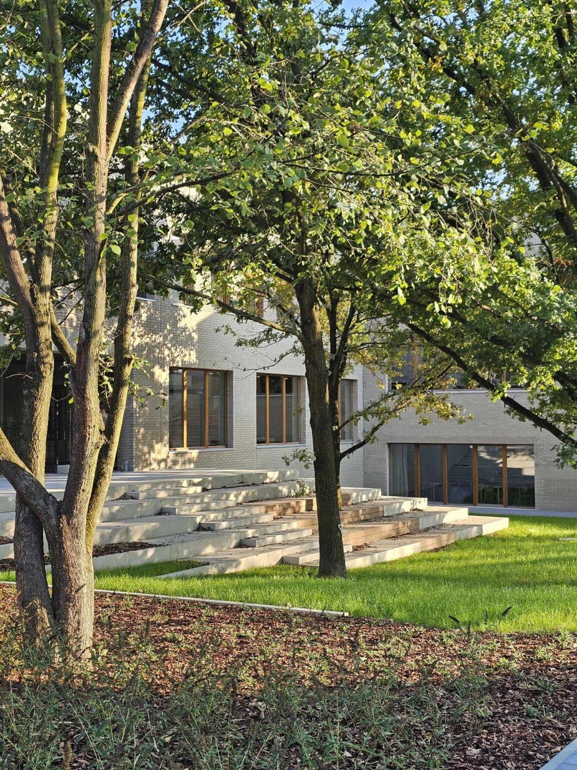 Dwukondygnacyjny budynek, ze względu na ukształtowanie terenu, ma półpoziomy. Wymagało to od projektantów precyzyjnego zaplanowania układów komunikacyjnych i instalacyjnych. Szkołę wykonano w technologii żelbetowej z działowymi przegrodami murowanymi, co pozwoliło na dużą elastyczność w kształtowaniu przestrzeni. Duże drewniane okna oraz przeszklony dach nad centralnym holem zapewniają dostęp światła dziennego, a to pozytywnie wpływa na koncentrację i samopoczucie uczniów. Z sal przedszkolnych można wyjść bezpośrednio do ogrodu przez wielkowymiarowe tarasowe drzwi przesuwne. W oknach od strony wewnętrznej zamontowano elektrycznie sterowane zasłony zacieniające, które chronią przed przegrzewaniem pomieszczeń i zapewniają odpowiedni komfort użytkowania.