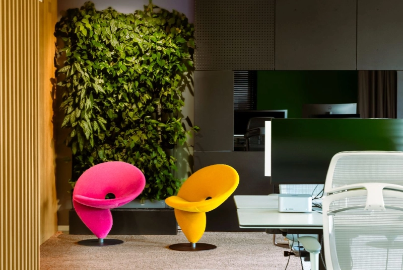 Przestrzenie projektowane zgodnie z zasadami biofilnego designu mogą realnie wpływać na zdrowie użytkowników. Odpowiednio dostosowane do rytmu dobowego światło oraz obecność zielonych elementów w biurze poprawiają samopoczucie i nastrój. Zacieranie granicy pomiędzy wnętrzem a otoczeniem zewnętrznym dodatkowo wprowadza poczucie spokoju i wyciszenia, pomagając redukować stres i napięcie. Tak zaprojektowane środowisko wspiera kreatywność i produktywność oraz sprzyja obniżeniu kortyzolu i ciśnienia krwi.