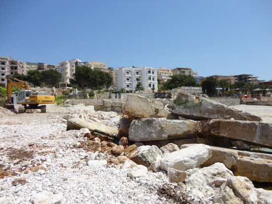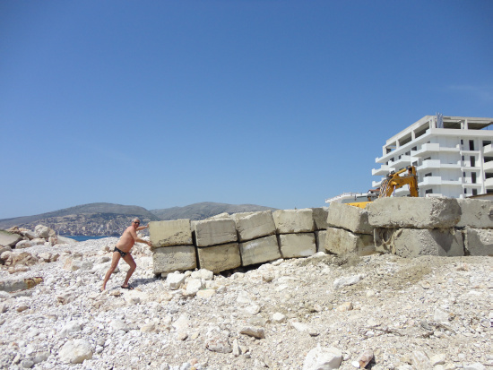 W sytuacji ekonomicznej ogarniętej recesją Europy i szerzącego się bezrobocia ważne jest tworzenie nowych miejsc pracy. I wydaje się, że tu właśnie Albania oferuje bardzo szerokie perspektywy, co sami sprawdziliśmy. Jako przedstawiciele branży budowlanej, nie czekając nawet na formalny angaż, samorzutnie, w trakcie urlopu uporządkowaliśmy kawałek wybrzeża, układając w stosy betonowe bloczki, czy przepychając na właściwe miejsce porzuconą koparkę (marki Liebherr, ale to można zrozumieć, bo Daimler-Benz nie produkuje koparek), fot. 12 i 13.