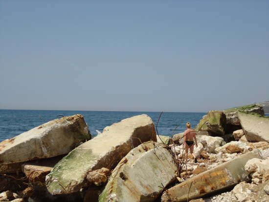 Przyspieszona rozbiórka potężnych nadmorskich fortyfikacji okazała się więc koniecznością. Dała miejsce pod nowe inwestycje i zapewne także stal kształtową do ponownego wykorzystania. Gruz, jako mniej potrzebny na razie został, jedynie trochę przepchnięty w stronę linii wody (fot. 10), bo do hotelu trzeba jeszcze dobudować pomost z panoramiczną restauracją, urządzić promenadę, itd. Może cierpi na tym trochę spaczone, zachodnioeuropejskie poczucie estetyki, ale spacer czy kąpiel w takiej scenografii pozostają niezapomniane (fot. 11).