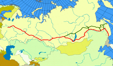 fot. 1. Schemat trasy Kolei Transsyberyjskiej (lina czerwona), na zielono trasa BAM-u