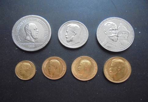 - złote 5, 7,5, 10 i 15 rublówki z lat 1898, 1897, 1901 i 1897