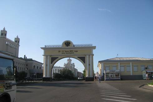 Brama tryumfalna w dzisiejszym Ułan Ude (obecnie to już autonomiczna republika Buriacji), który wówczas nazywał się Wierchoudinsk, z datą 20 - 21 czerwca 1891 roku, tj. wzniesiona 3 miesiące po ww. decyzji (fot. 5) do dziś stoi. Upamiętnia ówczesną wizytę imperatora i dobitnie świadczy, że budowę rozpoczęto na raz w kilku miejscach.