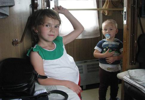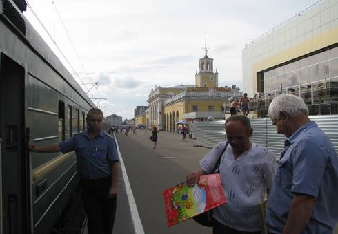 Podobny postój w Daniłowie, a potem już tylko króciutkie przystanki, w Buju nawet 5 minut, ale padający deszcz i ziewający prowadnik nie zachęcają do wysiadania. Powoli zapada zmierzch, krajobrazy za oknem stają się smutne, dworce puste, najwyższa pora na zaimprowizowaną kolację, przygotowanie legowisk, a nawet pierwsze kontakty z rosyjską młodzieżą (fot. 10) - dobrze ułożoną, tu chyba nikt nie słyszał o tzw. bezstresowym wychowywaniu dzieci.