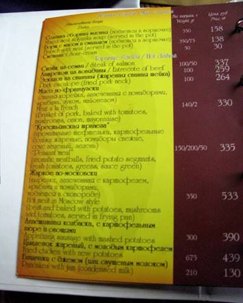 fot. 20. Menu (dla mniej wtajemniczonych – w 2011 roku 1 rubel odpowiadał ok. 11 naszym groszom)