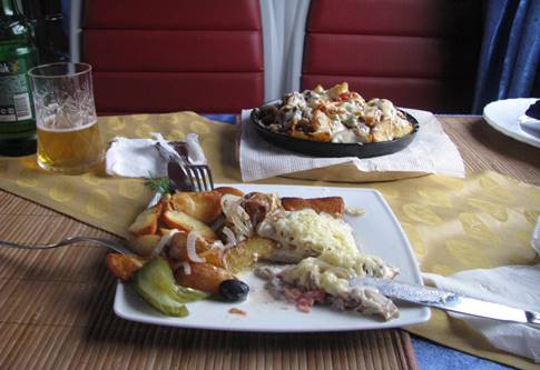 Ale wróćmy do pociągu. Pierwszą część trasy, wagon i jego zwyczaje, toaletę już omówiliśmy, ale co z jedzeniem? Tu opcje są dwie. Dla bogatszych (nie ma ich zbyt wielu - fot. 19) wagon-restaurant, z menu ocierającym się o moskiewskiego Sheratona (fot. 20). Co ciekawe wagon prowadzony przez ajenta, bowiem w 2011 roku administracja kolejowa jeszcze swojego „Warsu” nie wykształciła. Ale na przyszłość zostaje nadzieja, także i na to, że jakość kompozycji dania na talerzu również będzie ulegać poprawie (fot. 21).
