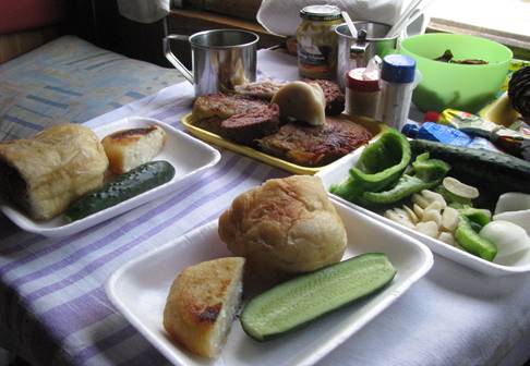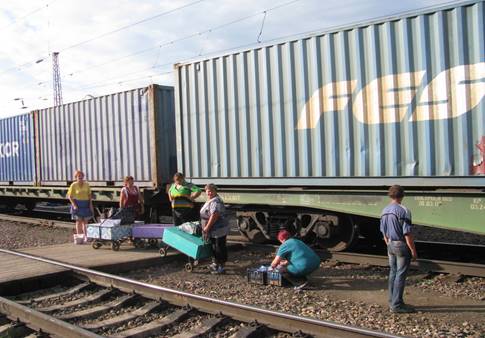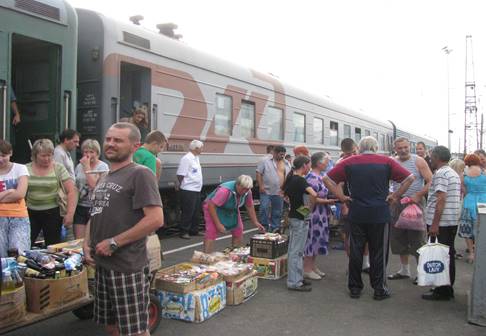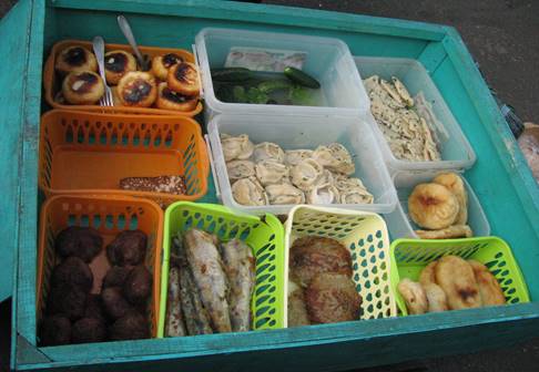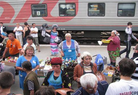 Druga opcja to self-service. Z zakupami nie ma najmniejszego problemu, na każdej stacji, gdzie wypada choć z 10 minut postoju, miejscowy handel dostarczy co dusza zapragnie pod drzwi wagonu (fot. 22 i 23). Nie tylko owoce czy pieczywo, nie ma problemu nabyć zupę z termosu, smażone kotlety, gorące kartofelki, kiszone ogórki i kapustę, wszelkiego rodzaju pierożki, wędzone ryby, ciasta (fot. 24). Wszystko świeże, raczej smaczne i dość tanie.