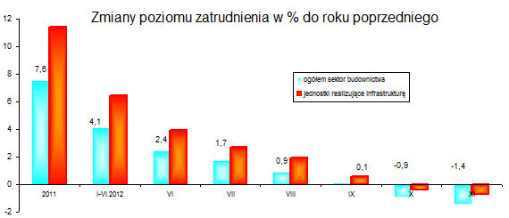 Największy wzrost zatrudnienia w budownictwie miał miejsce w latach 2007–2008, kiedy rozpoczynano realizację programów infrastrukturalnych i drogowych. Jeszcze w 2011 r. zatrudnienie ogółem wzrastało o 7,6%, a w przedsiębiorstwach inżynierii lądowej i wodnej o 11,4%. W pierwszym półroczu 2012 wzrost zatrudnienia zmniejszył się do 4,1%, a potem odnotowano (niewielki wprawdzie) ale spadek poziomu zatrudnienia. Udział jednostek realizujących zadania infrastrukturalne w zatrudnieniu ogółem budownictwa w całym okresie był względnie stabilny, wynosił około 30%, a przedsiębiorstwa inżynierii lądowej i wodnej wykazywały „łagodniejsze” zmiany poziomu zatrudnienia.