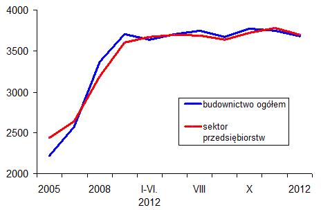 Wysoki wzrost budownictwa miał miejsce w 2011 roku i pierwszych miesiącach 2012, na co wpływała „presja” na zakończenie projektów infrastrukturalnych i drogowych przed EURO 2012. Od czerwca 2012 produkcja zmniejszała się w kolejnych miesiącach. Wahaniom w produkcji budowlanej towarzyszyło załamanie kondycji finansowej przedsiębiorstw i brak stabilizacji na budowlanym rynku pracy. Wprawdzie poziom zatrudnienia zmniejszał się umiarkowanie (przedsiębiorstwa oczekują na poprawę koniunktury), ale spadek wynagrodzenia był znaczący.