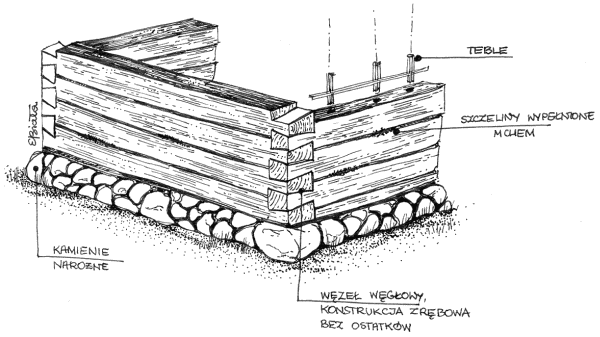 Historyczne, drewniane budynki mieszkalne na Podlasiu posiadały konstrukcję zrębową opartą na układanych kolejno na sobie warstwach belek. Najniższa warstwa, nazywana podwaliną spoczywała na dużych kamieniach narożnych, pomiędzy którymi układano mniejsze. Szczeliny między belkami zrębu wypełniano mchem. Belki łączone były teblami.