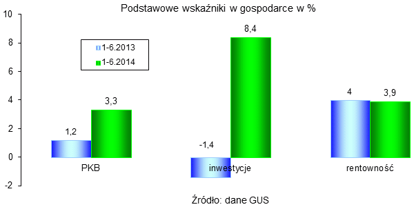 W pierwszym półroczu 2014[1] w gospodarce notowano dobre wyniki: wzrost PKB wynosił 3,3% (rok temu niewiele ponad 1%), wzrosły nakłady inwestycyjne (podczas gdy w ubiegłym roku inwestycje spadały), wyniki finansowe sektora przedsiębiorstw były nieco lepsze od notowanych w pierwszym półroczu 2013, chociaż bardzo zróżnicowane w działach gospodarki.
