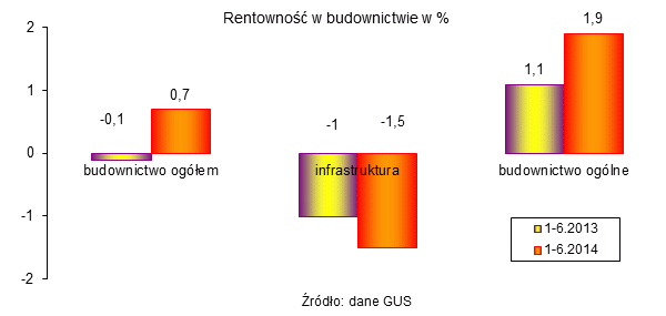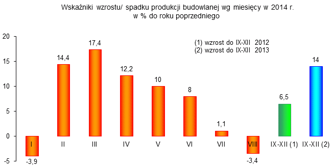 Pierwsze półrocze 2014 r. wskazywało, że następuje odbudowa rynku budowlanego (wzrost produkcji budowlanej wynosił 9,8%), ale wyniki od czerwca do sierpnia były niepokojące. Produkcja przedsiębiorstw budowlanych zatrudniających > 9 osób (czyli tych, które decydują o rynku i o skali produkcji) wzrastała w lipcu tylko o 1,1%, a w sierpniu odnotowano spadek o 3,6%. W okresie styczeń - sierpień 2014 produkcja budowlano-montażowa obejmująca roboty o charakterze inwestycyjnym i remontowym, zrealizowana przez przedsiębiorstwa budowlane o liczbie pracujących powyżej 9 osób, była o 5,2% wyższa niż w analogicznym okresie ub. roku, ale dwa lata temu (w 2012 roku) poziom produkcji budowlanej był w takim samym okresie wyższy o około 14% niż obecnie.