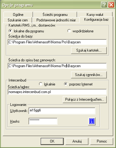 Aby móc korzystać z InterCenBudu za pośrednictwem Internetu należy wykupić w firmie Athenasoft lub u jej przedstawiciela handlowego prawo dostępu do bazy. Gdy formalności zostaną już załatwione, trzeba w Normie z menu Opcje wybrać hasło Programu i w oknie Opcje programu wybrać zakładkę Konfiguracja baz.