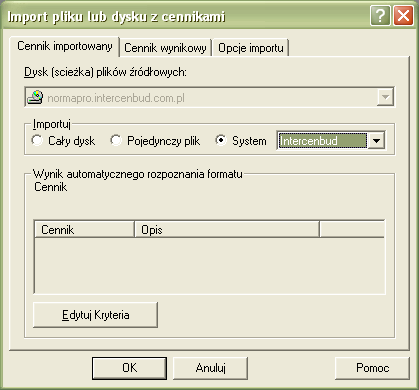 Aby utworzyć cennik zawierający ceny średnie z InterCenBudu musimy z menu Bazy cenowe lub Ceny wybrać hasło Importuj cennik i w oknie, które się pokaże, zaznaczyć hasło System, następnie z listy obok wybrać hasło Intercenbud i nacisnąć przycisk Edytuj kryteria.