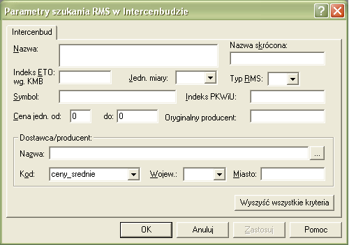 Pokaże się wówczas okno Parametry szukania RMS w Intercenbudzie. Musimy w pole Kod wpisać ceny_srednie i zatwierdzić OK.