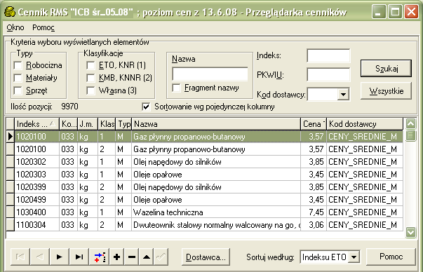 Gdy zakończy się pobieranie danych i wstawianie ich do cennika, program pokaże okno zawartości cennika.