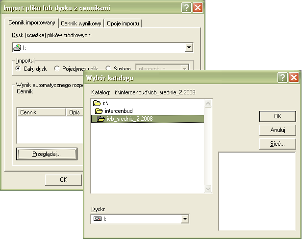 W tym celu wkładamy do napędu płytę InterCenBudu i z menu Bazy cenowe w Normie wybieramy hasło Importuj cennik. W oknie Import pliku lub dysku z cennikami zaznaczamy hasło Cały dysk i naciskamy przycisk Przeglądaj. Pokaże się okno Wybór katalogu i musimy zaznaczyć folder icb_srednie_2.2008.