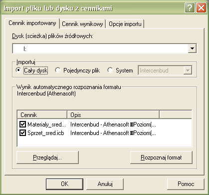 Po naciśnięciu OK w oknie Import pliku lub dysku z cennikami pojawi się w polu cenników informacja, że są do pobrania ceny średnie materiałów i ceny średnie pracy sprzętu. Możemy zaznaczyć czy chcemy oba, czy tylko jeden z pokazanych cenników.