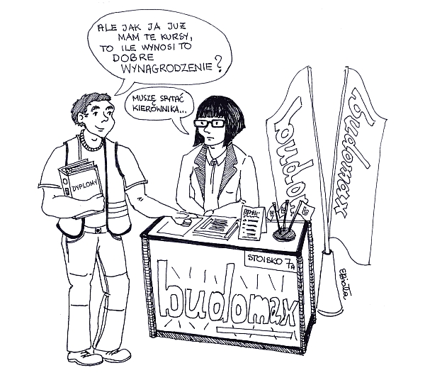 Targi pracy – tłum ludzi przemieszczających się między stoiskami, na których przeważają oferty niewzbudzające nadmiernego entuzjazmu przeglądających. Przeważnie oferty pracy biurowej, firm zajmujących się przetwórstwem przemysłowym, gdzieniegdzie szwalnia, piekarnia, czasem urząd lub podmioty i spółki samorządu. Wystawcy szukają kogoś z doświadczeniem, pracownicy „z doświadczeniem”, których wydaje się być znacznie więcej niż świeżych absolwentów, rozglądają się za pracą wynagradzaną znacznie lepiej niż minimalnym wynagrodzeniem za pracę. Sporadycznie wśród tego pochodu ofert pojawiają się stoiska firm budowlanych. Moje zainteresowanie podjęciem pracy jako robotnik ogólnobudowlany za niezbyt wysoką stawkę, skłoniło wystawcę do krótkiej rozmowy. Zaczęło się jak zwykle od narzekania na szkolnictwo zawodowe i nowe plany urzędników w tym zakresie, dyskusja płynnie potem przeszła na „nic nieumiejącą i leniwą młodzież”, zatrzymując się na wyjaśnieniach, dlaczego takie niskie wynagrodzenie. Na szczęście wyglądam na swój wiek, bo mój rozmówca obiecał, że jak tylko „się sprawdzę” wyślą mnie na kurs operatora maszyn, a wtedy moje wynagrodzenie będzie znacznie wyższe. Przekonywał, że podstawą dobrej pracy są wszelkie uprawnienia, jakie uda mi się zrobić – od montażu rusztowań, do operatora zgarniarko-koparki. „Im więcej takich papierów, tym łatwej znaleźć dobrą pracę”. I choć faktycznie tego nie widać, to…