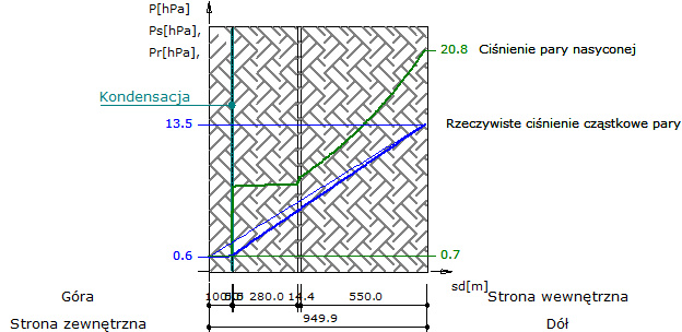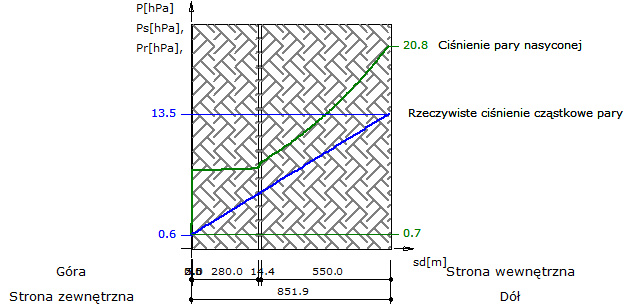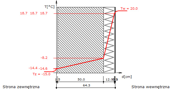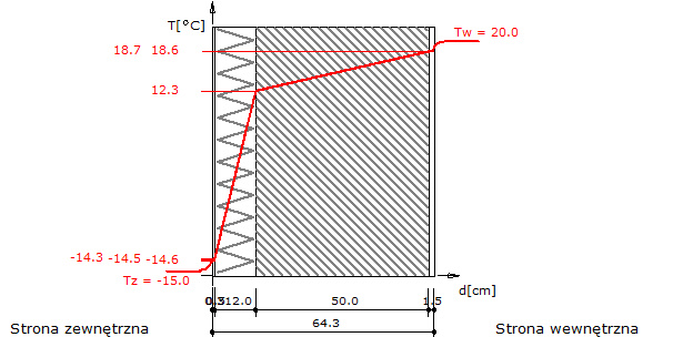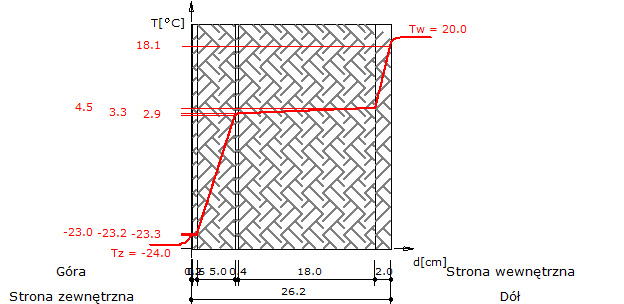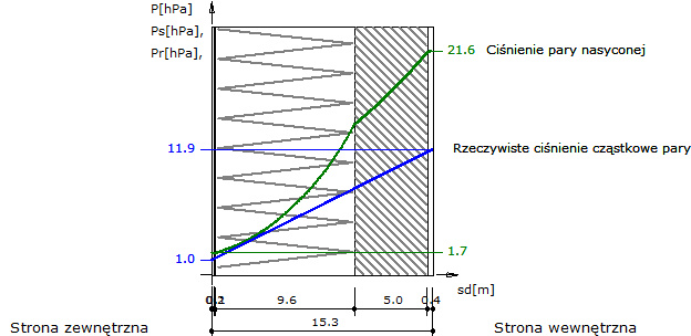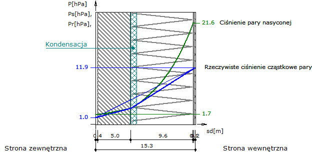 Współczynnik U wynosi 0,274 W/m²*K (jest mniejszy od 0,3 W/m²*K). Przy założonej niewielkiej wilgotności względnej powietrza (60%) i temperaturze w zimie tylko -15°C w przegrodzie nie dzieje się nic złego, nie ma kondensacji ani skraplania się wilgoci na wewnętrznej powierzchni (geometrię, parametry i wykresy temperatury i rozkładu ciśnień pary wodnej wykonane numerycznie pokazano na rysunku 1).