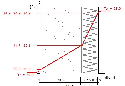 Rys. 3 - Obliczeniowy rozkład temperatury dla stanu stacjonarnego w przegrodzie podanej w powyższej tabeli dla zewnętrznej temperatury +25°C. Temperaturę powierzchni tynku w słońcu pokazano na fot. 1a.