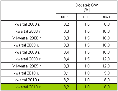 Z zestawienia wynika, że średnia wielkość dodatku z tytułu GW nie zmieniała się znacząco między poszczególnymi kwartałami – maksymalna różnica wartości średniej wynosi 0,3 punktu procentowego.