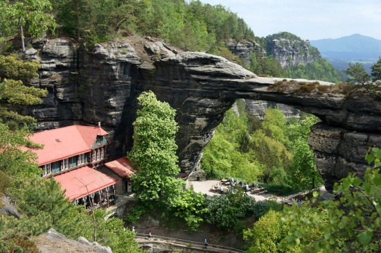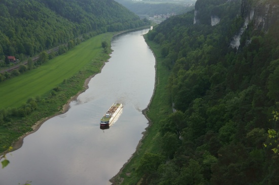 Dobrze, że to tylko 15 km do przejechania drogą i mostem przez Łabę lub (ja wybrałem tę drogę) 10 km samochodem i piesza przeprawa promowa przez meandrującą rzekę. Bastei (czyli "baszta") wraz z kamiennym mostem to formacja skalna stanowiąca jedną z największych atrakcji turystycznych Parku Narodowego Saskiej Szwajcarii. Pierwsze wzmianki pisemne o skałach pochodzą z końca XVI w. W 1826 roku w pobliżu punktu widokowego zbudowano pierwszą kwaterę noclegową dla turystów oraz wzniesiono pierwszy, drewniany most nad wąwozem Mardertelle, który łączył zewnętrzną półkę skał z zamkiem Neurathen (ruiny z XII w.). W połowie XIX w. konstrukcja została przebudowana na piaskowcową ze względu na dużą ilość turystów. Most ten osiągnął długość 76,5 m długości i wzniósł się na wysokość 40 m ponad dno wąwozu i jest głównym celem wędrówki rzeszy turystów. Widoki z mostu i licznych platform widokowych na spektakularne formacje skalane wznoszące się majestatycznie na blisko 200 metrów nad poziom doliny rzeki Łaby potrafią zachwycić każdego.