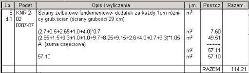 - Wartości nakładów w pozycji (dziale lub całym kosztorysie) jest sumowana i wyliczane są narzuty z precyzją podsumowania pozycji (lub podsumowania kosztorysu).