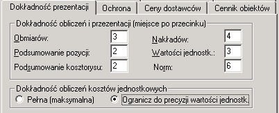 Jeżeli w grupie 'Dokładność obliczeń kosztów jednostkowych' zaznaczymy opcję Ogranicz do wartości jednostk., to precyzja obliczania kosztów jednostkowych zostanie ograniczona do dokładności wyświetlania na ekranie, jeśli zaś opcję Pełna (maksymalna) - wartości te obliczane będą w pełnej precyzji, jaką daje komputer.