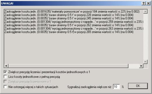 Gdy komunikat z listą ostrzeżeń pojawi się pierwszy raz, można w nim skorygować opcje prezentacji wartości znajdujące się w opcjach kosztorysu na karcie 'Dokładność prezentacji'. Jeśli na przykład widzimy, że różnice wartości kosztów jednostkowych są zbyt duże, możemy zwiększyć dokładność o rząd wielkości zaznaczając opcję Zwiększ precyzję liczenia i prezentacji kosztów jednostkowych o 1 i/lub włączyć opcję obliczania ich z pełną precyzją (Licz koszty jednostkowe z pełną precyzją). Jeśli błędy przeliczania wartości norm przekraczają założony procent, możemy zaznaczyć opcję Zwiększ precyzję liczenia norm o 1, co spowoduje zwiększenie dokładności obliczeń i prezentacji norm o rząd wielkości.