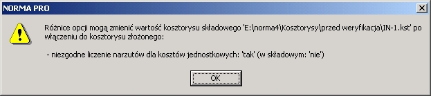Jeśli tworzymy kosztorys złożony z kilku innych kosztorysów i opcje kosztorysu głównego różnią się od opcji przyjętych dla kosztorysów składowych, program wyprowadza ostrzeżenie i informuje, jakie opcje zostały inaczej określone (rys.6). Z powodu różnic opcji wartość kosztorysu złożonego może nie być równa sumie wartości kosztorysów składowych.