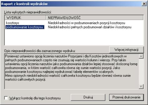 Jeśli w kosztorysach sami ustalamy opcję liczenia narzutów, dobrze jest zaznaczyć pole wyboru Sprawdzanie sposobu liczenia narzutów na karcie 'Liczenie narzutów' i wtedy program będzie generował ostrzeżenia w przypadku wystąpienia niedokładności wyliczeń wartości pozycji i podsumowań, gdy będziemy drukować kosztorys ofertowy (rys. 7). W dolnej części okna kontroli wydruków wyświetlana jest informacja o tym, z jakimi niedokładnościami mamy do czynienia.