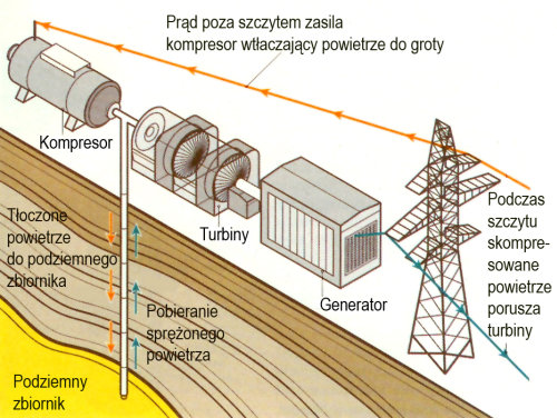 Typowy system energetyczny bazujący na sprężonym powietrzu składa się z zespołu sprężarek, służących do wtłaczania powietrza do zbiornika podziemnego w wyeksploatowanym wyrobisku, zespołu turbin gazowych zasilanych gazem ziemnym i sprężonym powietrzem ze zbiornika, odzysknicy podgrzewającej sprężone powietrze kierowane do turbin gazowych za pomocą ciepła spalin z tych turbin, a na końcu maszyny elektrycznej odwracalnej, która w zależności od bieżących potrzeb pełni funkcję silnika elektrycznego napędzającego sprężarki lub generatora energii elektrycznej napędzanego przez turbiny gazowe. Maszynę elektryczną napędzamy oczywiście energią otrzymaną z OZE – najczęściej dostarczają ją farmy wiatrowe. Dlatego największym problemem jest powiązanie lokalizacji zbiornika z farmą wiatrową. I kolejny problem, to opłacalność tylko dla dużych instalacji.