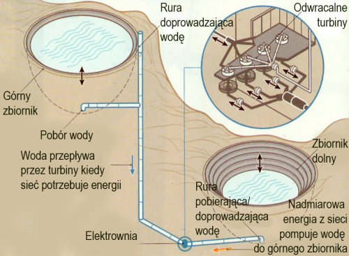 Pozostały elektrownie szczytowo-pompowe. Jak w opisanych powyżej przypadkach, aby przynosiły zysk muszą być „duże” i również, tak jak wcześniej omówione, mają często problem lokalizacyjny. Jak działają? Zasada działania jest identyczna, jak w każdej elektrowni wodnej – wykorzystuje się turbiny napędzane spadkiem wody. Z tym, że wodę do górnego zbiornika tłoczy się za pomocą pomp z niższego używając tańszego prądu, zakupionego poza szczytem, a podczas największego zapotrzebowania na prąd spuszcza się ją do niższego uruchamiając turbiny.