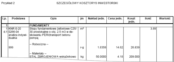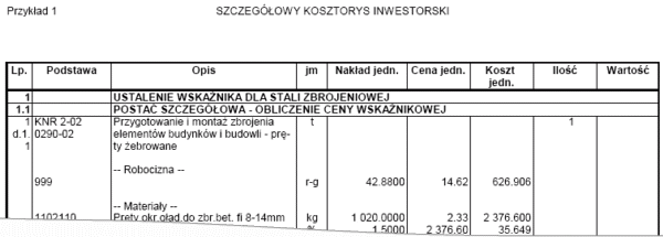 W podanym przykładzie proszę zwrócić uwagę na dział 1.1 Stal zbrojeniowa wg projektu, w którym rozliczamy stal zgodnie z ilościami, rodzajami i średnicami wg rysunków konstrukcyjnych. A więc obliczamy w kosztorysie jej rzeczywiste ilości i ceny.