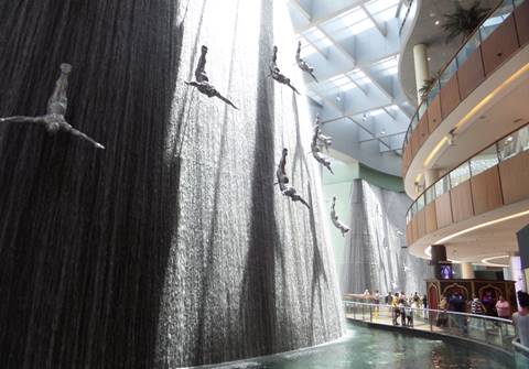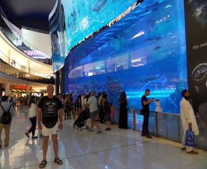 Co jest w środku tego molocha? Ok. 1300 sklepów światowych firm, w tym kilkaset odzieżowych, gdzie kupić można najbardziej awangardowe kreacje (jak na fot. 11); spore (największe na świecie) wbudowane akwarium, 10 mln litrów wody, z ok. 300 rekinami i płaszczkami oraz 32.000 innych stworzeń (fot. 12); dość duży wodospad, gdzie spłukani finansowo na zakupach klienci popełniają masowe samobójstwa skacząc głową w dół (fot. 13).