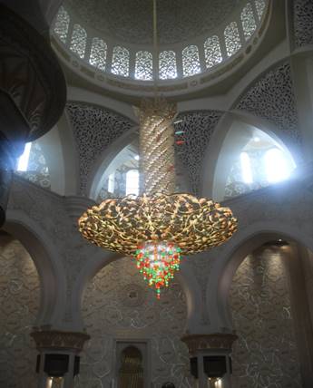 Trochę jednak nadrabiają elementy wystroju architektonicznego – 82 kopuły i 1048 kolumn oraz wyposażenia, jak np. największa na świecie powierzchnia okładzin z białego marmuru z Carrary, z bardzo subtelnymi ornamentami (fot. 17), największy na świecie dywan w głównej nawie, ok. 4700 m² (fot. 18), największy na świecie żyrandol o masie 12.000 kg (fot. 19).