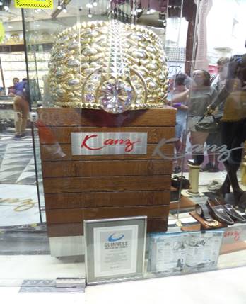 Warto też podkreślić, że w ZEA duże są nie tylko rzeczy z samej istoty duże. Duże są też rzeczy, które z zasady powinny być małe. Np. pierścionek, w witrynie jednego z ciągu sklepów uliczki – targu złota jest wystawiony taki dość spory, 63,8 kg 24-karatowego złota. Żona go nawet oglądała, ale uznała za niepraktyczny do noszenia, a wozić ze sobą na taczce też głupio, więc został na miejscu, razem z umieszczonym pod nim certyfikatem, że jest największy na świecie (fot. 28).