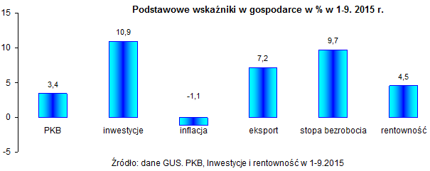 W okresie styczeń – wrzesień 2015 w polskiej gospodarce utrzymywało się umiarkowane, dość stabilne tempo wzrostu, przy zróżnicowaniu w obszarach gospodarki. PKB zwiększył się o 3,4%, a Polska plasowała się wśród krajów UE o najwyższym wzroście.