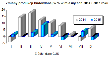 Oczekiwania na wzrost budownictwa były i są duże. Niestety, potwierdzają się opinie wyrażane w poprzednich raportach, że budownictwo jest najsłabszym i niestabilnym sektorem w gospodarce, chociaż nadal uzyskuje najwięcej pomocy ze środków unijnych na infrastrukturę i uruchamiane są programy wspomagające budownictwo mieszkaniowe. W 2015 r. w budownictwie występują wahania. Po wzroście obserwowanym w pierwszych miesiącach, w maju produkcja budowlana osłabła, a w czerwcu odnotowano spadek o 2,5%; lipiec potwierdzał słabą koniunkturę na rynku budowlanym; z kolei sierpień „zaskoczył” wzrostem produkcji budowlanej, a we wrześniu produkcja budowlana była ponownie niższa niż rok temu o 2,5%. W tej sytuacji 2% wzrost rynku budowlanego po trzech kwartałach 2015 osłabia nadzieję na przełamanie dekoniunktury w najbliższym czasie.