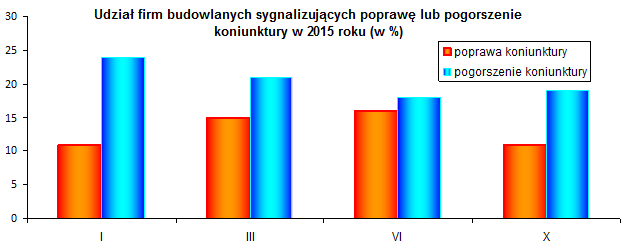 W pierwszych miesiącach 2015 roku optymistycznym wskaźnikiem był rosnący udział firm sygnalizujących poprawę koniunktury. Tendencje te uległy zmianie; maleje udział firm sygnalizujących poprawę koniunktury a coraz więcej firm wskazuje na jej pogorszenie. Według ostatnich badań (z października br.) poprawę koniunktury sygnalizowało 11% przedsiębiorstw, a jej pogorszenie – 19%.