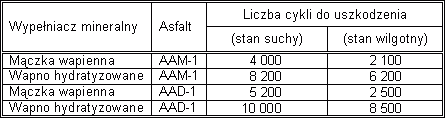 Tablica 2. Wpływ wapna hydratyzowanego na wydłużenie odporności na cykliczne obciążenia