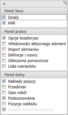 W przypadku, gdyby nasz program nie pokazywał prawego panelu, należy go aktywować poprzez zaznaczenie na Liście paneli -> Panel prawy -> Opcje kosztorysu.